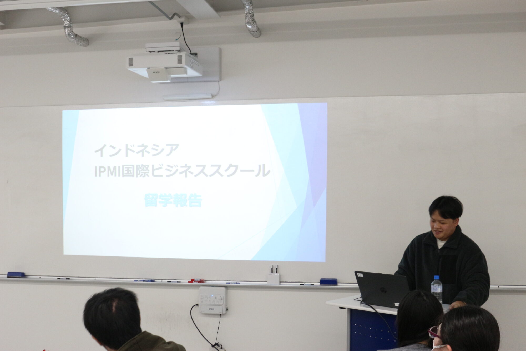 報告会では、IPMIでの授業の様子や学生の学習姿勢、インドネシアの食文化や観光スポットなどについて、写真を交えながら紹介してくれました。特に、IPMIの学生が積極的に自ら質問し、主体的に学ぶ姿勢に強い刺激を受けたことが印象的だったようで、「自分ももっと積極的に行動したい」と語っていました。